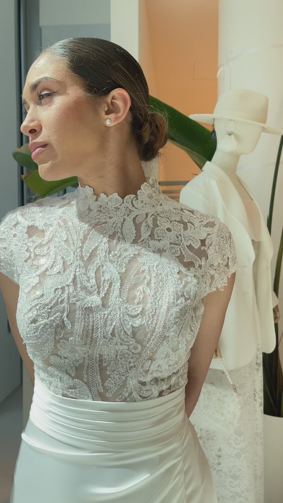 Am Oberteil bildet das Spitzenmieder mit Schwanenhalsausschnitt und Kappenärmeln einen raffinierten Kontrast zum verführerischen Rückenschlitz, während der Satinrock, der leicht von der Taille im Schärpen-Stil abfällt, die Figur der Braut leicht umschmeichelt und in einen raffinierten Schlitz übergeht.