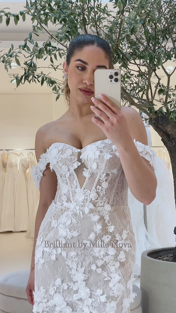 Ein exquisites Meerjungfrauenkleid, gefertigt aus luxuriöser Chantilly-Spitze, zart verziert mit 3D-Blumenapplikationen. Es verfügt über einen herzförmigen Ausschnitt mit einem V-Ausschnitt darunter, eingearbeitete Cups in einem strukturierten Korsett mit Stäbchen, schulterfreie Ärmel, die mit 3D-Blumen verziert sind, halbtransparente Einsätze am Oberteil, um die Kurven zu betonen, und einen Reißverschluss am Rücken. Der figurbetonte Rock erstreckt sich anmutig in eine zarte Schleppe und rundet das Erscheinungsbild ab.